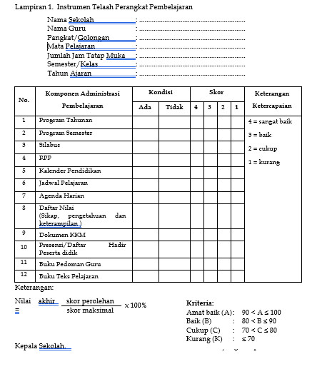 Adapun instrument dalam melaksankan supervise perangkat pembelajaran dapat di lihat di bawah ini.