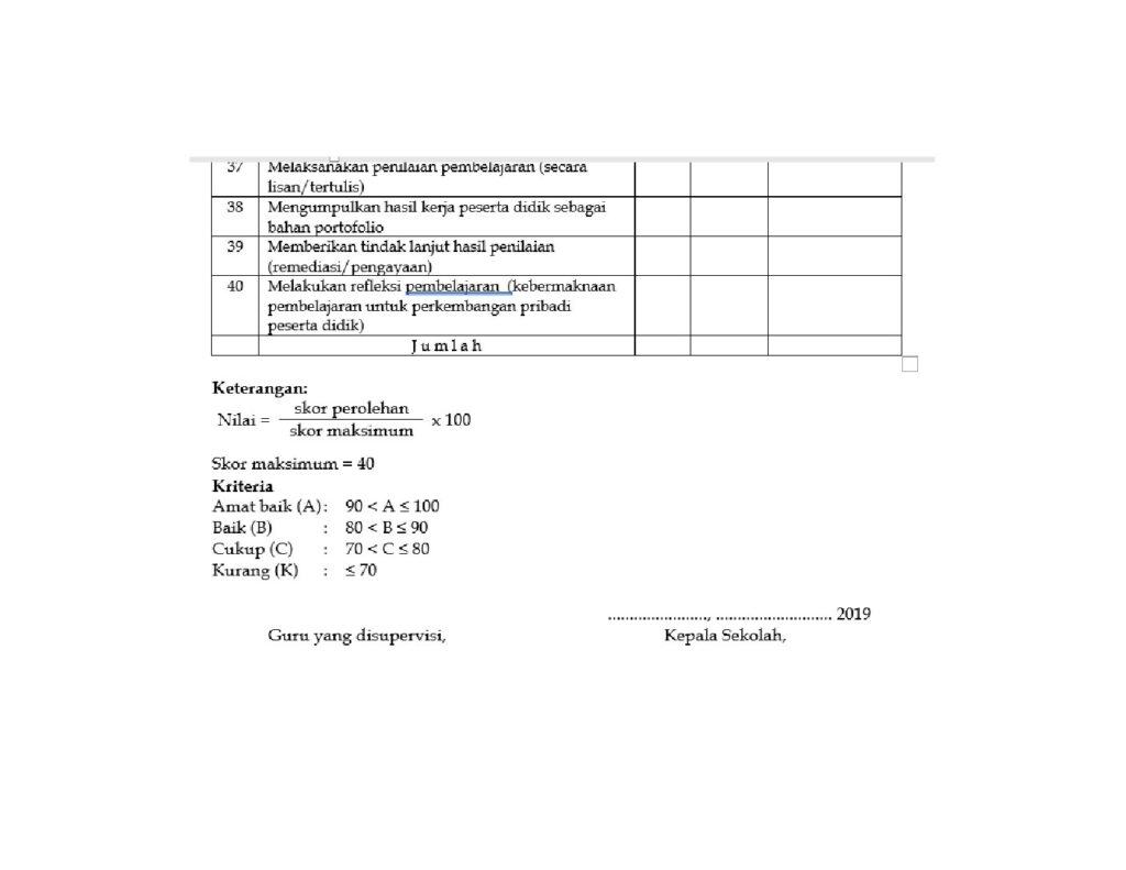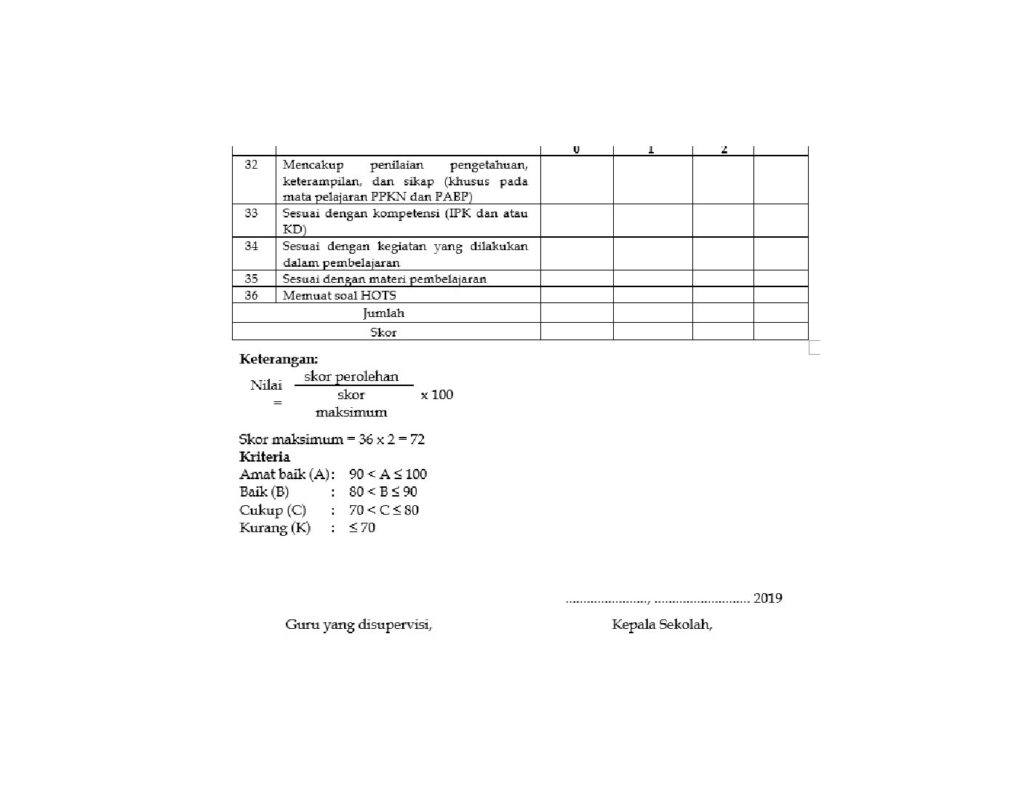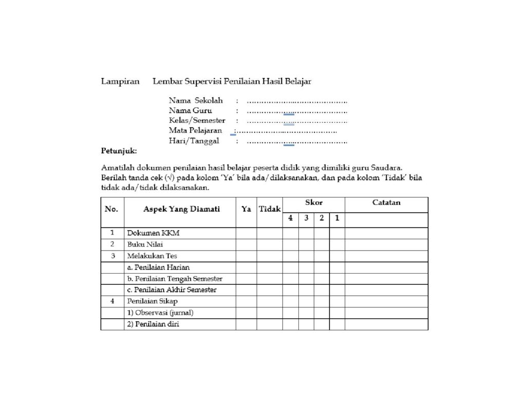 Adapun instrument dalam melaksanakan supervise penilaian hasil belajar dapat dilihat di bawah ini.