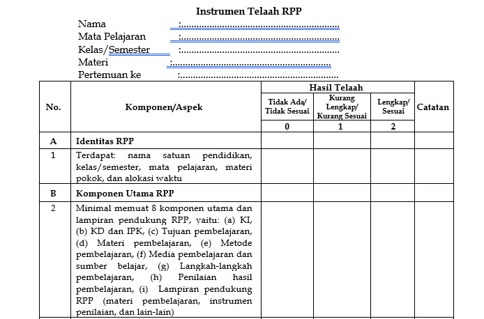 Untuk memudahkan pelaksanaan pemantauan, pelaksanaannya dapat menggunakan intrumen pemantaun Rencana Pelaksanaan Pembelajaran (RPP) seperti tertera di bawah ini: