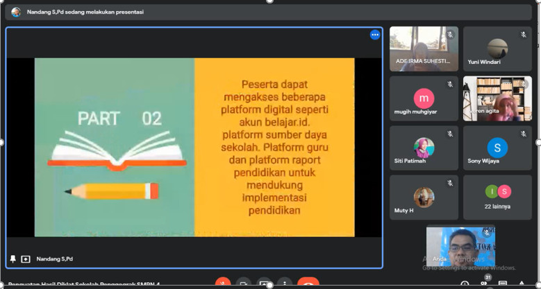 Workshop dilaksankan di hari Sabtu, 10 Juli 2021 dengan moda Daring. Setelah acara pembukaan dilanjutkan dengan materi penguatan hasil diklat sekolah penggerak yaitu materi pertama adalah Paparan tentang Kebijakan Sekolah Penggerak oleh Bpk. Ahmad Fadloli selaku kepala SMPN 4 Kotabaru dan dilanjutkan dengan materi ke 2 tentang” Pendidikan yang Memerdekakan oleh Nur Asih Setyuwati, SE. Selanjutnya materi ke 3 materi tentang “ Capaian Pembelajaran” oleh Yuni Windari, S.Pd. dan materi ke 4 dan merupakan materi terakhir di hari pertama adalah penyajian tentang”Asesmen” oleh Muty Handayani, S.Pd. Dilanjutkan dengan materi “Literas Digital” oleh pak Nandang, S.Pd. Di akhir sesi hari pertama ditutup dengan kegiatan refleksi.