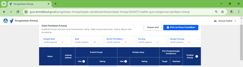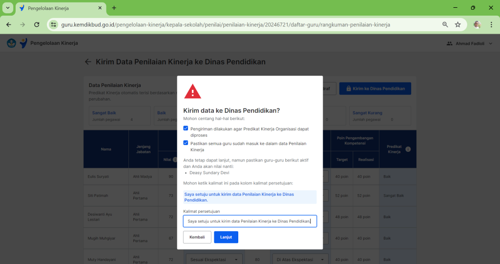 Pada sesi ini, kepala sekolah jangan buru-buru mengirimkan data ke Dinas Pendidikan. Jika sudah dikirimkan, maka data penilaian kinerja guru sudah tidak dapat diubah lagi. Untuk itu, cermati dulu data penilain kinerja guru dan jika ada yang belum sesuai maka kepala sekolah bisa mengubah data tersebut.