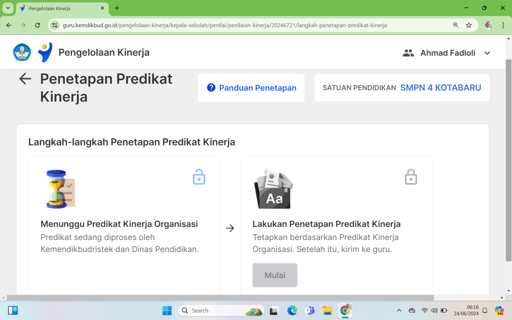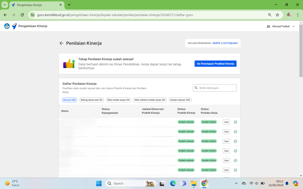 Setelah ini, masih ada satu tahapan lagi yaitu kepala sekolah melakukan penetapan predikat kinerja guru dan mengirimkannya ke guru yang dinilai berdasarkan predikat organisasi.